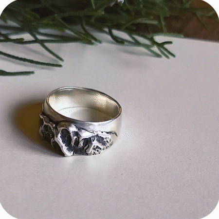 Este anillo nació como un pedido personalizado, la clienta me encomendó hacer esta pieza inspirada en el volcán TROMEN (Neuquén) para ella y su pareja. Fue tan lindo descubrir la existencia de este estratovolcán con su forma tan particular y su cumbre cortada por dos calderas, siendo además uno de los más altos de la Patagonia. Que no pude pasarlo por alto y decidí también incluírlo en mi colección.