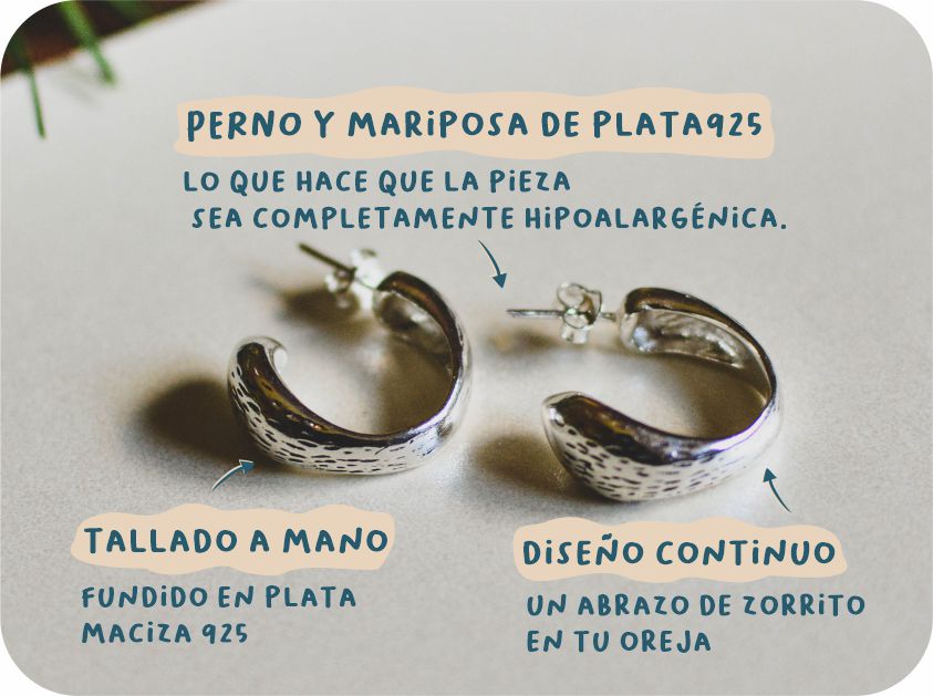 Esta pieza funde su esencia en un cálido abrazo. De un lado esa tierna patita que guarda mil historias y del otro esa cola esponjosa que brinda un cálido abrigo. Ustedes me ayudaron a bautizar el anillo y ahora se suman los AROS ABRAZO DE ZORRO.